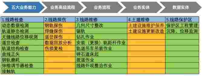 在轨道运维业务中,,,,,,我们形成了完整的从业务能力(业务域)-业务流程-业务实体-数据模型的分析梳理过程。。。。。轨道运维业务能力如下图所示::::::::::